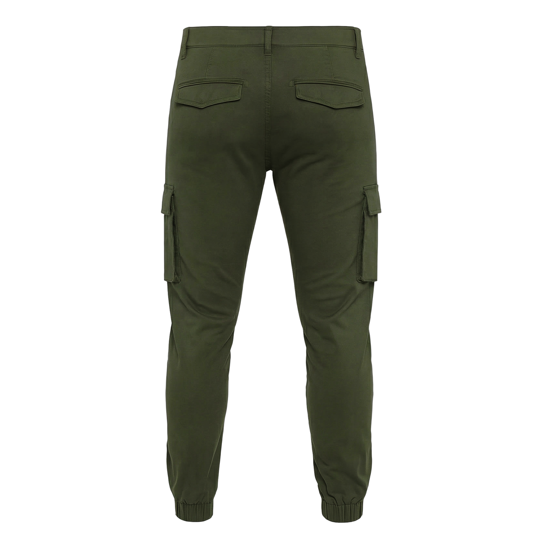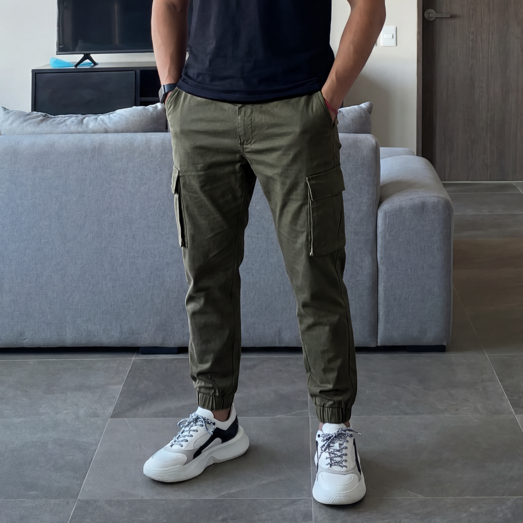 Ανδρικό καλοκαιρινό cargo παντελόνι από μαλακό ύφασμα με πλαϊνές τσέπες για casual εμφανίσεις και λάστιχο στους αστραγάλους.